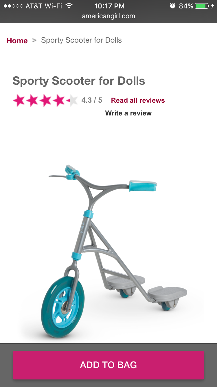 ReplyDeleteI bought the TM scooter, when it went on sale, my daughters ended up not liking them. From what I can recall, they had problem keeping the doll in a certain position so that the hands stayed under the clear band. One of the bands eventually broke.
